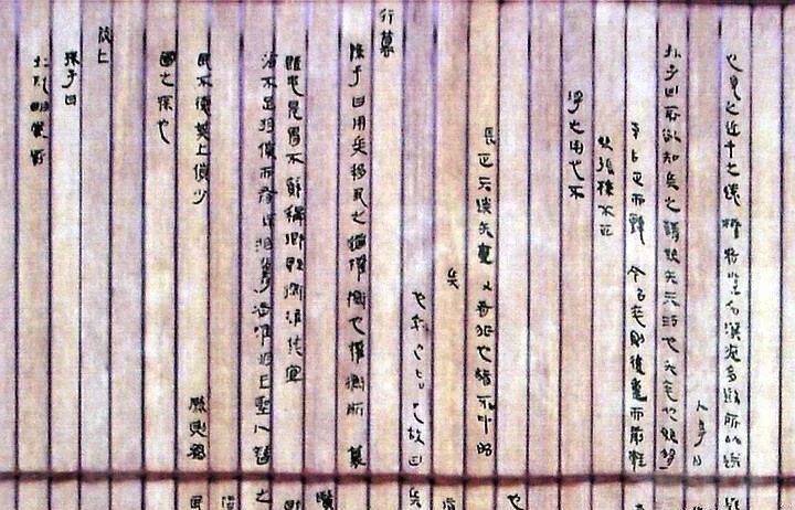 竹简则是一种大众化的书写工具,只需将随处可见的竹子削平整,便可以在上面书写文字。如果有错字,可以使用专门的刀具轻轻一刮,再写上正确的字即可。虽然取材容易,但由于竹简必须裁剪成宽度相当的平面,一支竹简记录的内容少则八九个字,多则几十字,要记录下一部书,需要很多的竹简,而且还要用皮绳将竹简编联起来,特别笨重。孔子晚年喜读《易》,当时这部《易》就是用牛皮绳编连起来的竹简书籍,这种编连方法叫“韦编”。孔子将之反复读了很多遍,以至于把牛皮绳都翻断了好几次,这就是成语“韦编三绝”的来历。除了阅读不便,竹简搬运也不容易。据说秦始皇每天都要阅读一车的竹简奏章,而西汉太中大夫东方朔撰文上呈汉武帝,所用的竹简奏章需要两个人抬进宫。