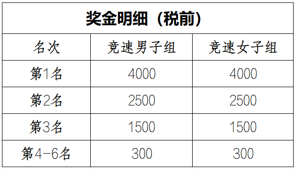 注:现场不发放奖金,所有获奖运动员在活动结束30日后,并经确认成绩无异议后将按获奖选手留给组委会的联系方式,通知选手办理领奖事宜,按规定程序支付奖金。如果发现有犯规违例者并且取得核实以后,取消该名次和奖金,后续名次不递补。