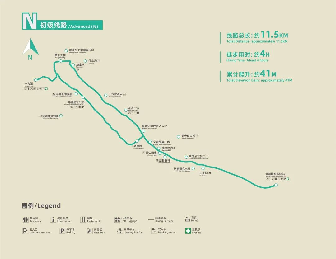 南河河滨徒步线是一条适合全龄段的N级路线,全长总计18.5公里,分为固驿段(约7KM)与文君段(约11.5KM)。