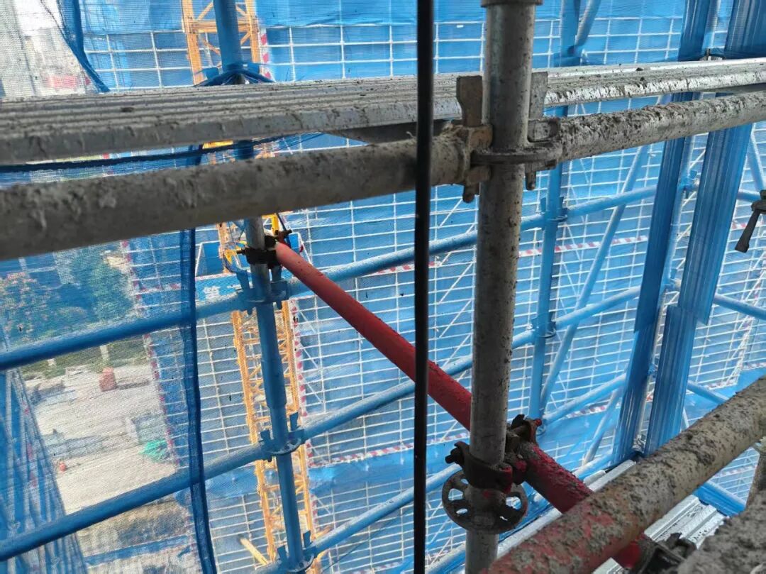 危险分析:外架若与主体贯穿但无防护措施,易造成高处坠落。
