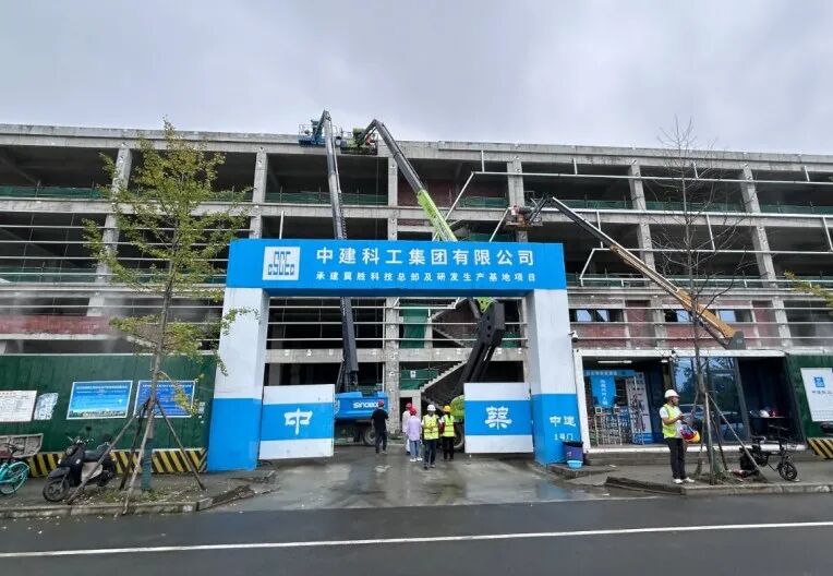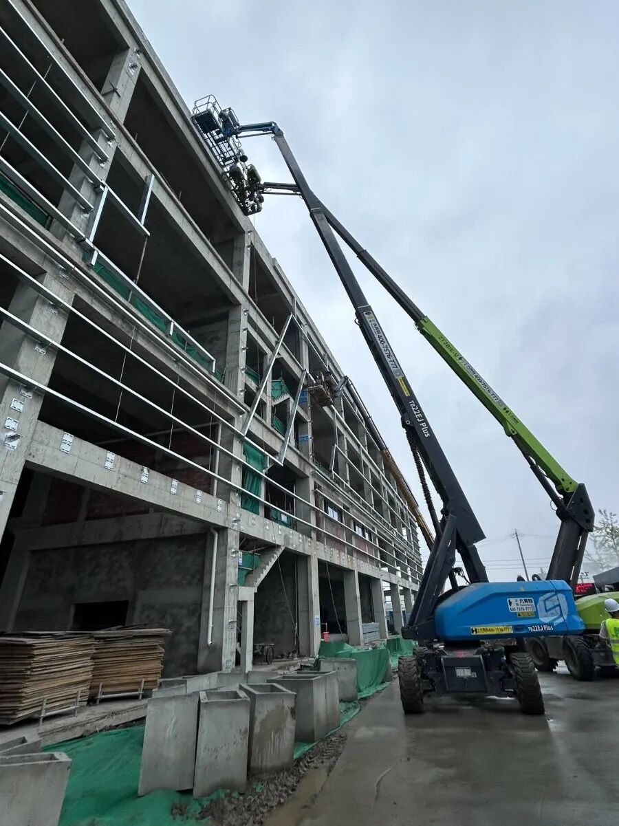 主体厂房和配套用房均已封顶,场地总平和建筑外装同步推进,多台高空作业车伸出长臂,工人们正专注地对主体厂房外立面装饰板的骨架进行焊接作业……
