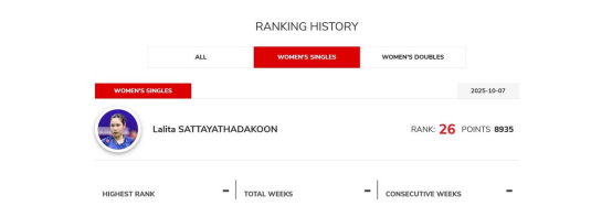 拉丽塔·萨塔亚塔达孔 Lalita SATTAYATHADAKOON:现世羽联青年排名,女单世界第26名。泰国青年一代中的中流砥柱,攻防兼备的打法极具个人魅力及观赏性。本次报名U17女单,绝对是冠军的最有力争夺者。