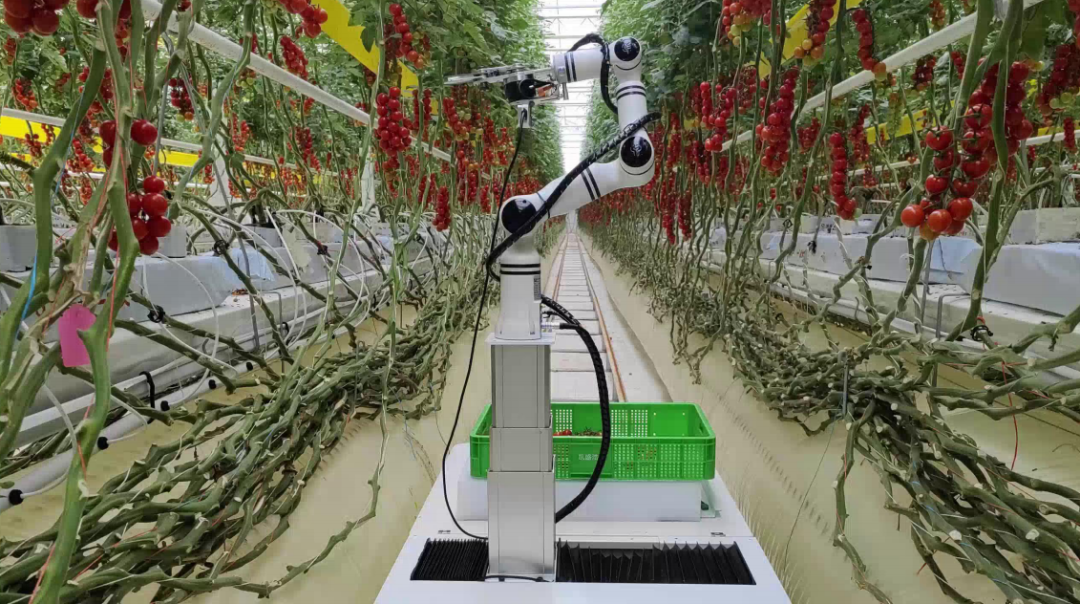 这是我们研发的一款AI采摘机器人,12秒就能采摘一串小番茄放入筐中,能够24小时不间断工作。目前,该AI采摘机器人正在甘肃、宁夏、西宁等地应用,除了采摘番茄外,还适用于草莓、猕猴桃等作物的采摘。