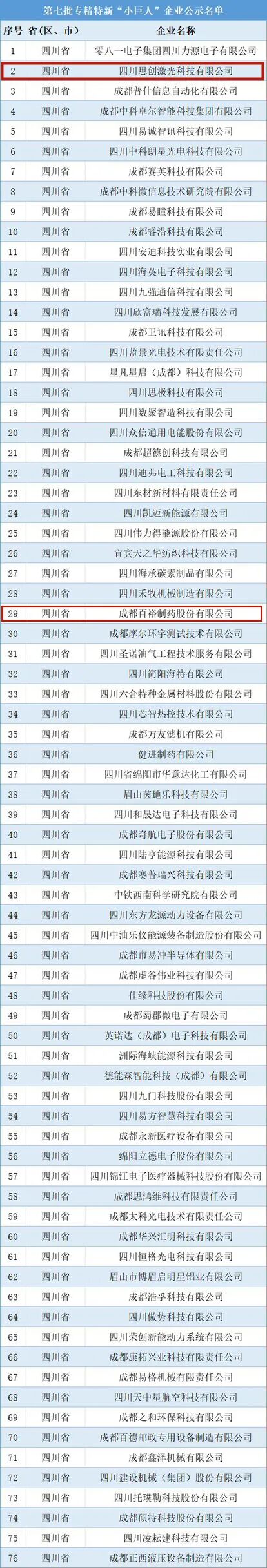 近日,根据工信部统一部署,四川省经济和信息化厅对拟认定的第七批国家级专精特新“小巨人”企业名单进行公示。温江企业四川思创激光科技有限公司、成都百裕制药股份有限公司符合《优质中小企业梯度培育管理暂行办法》中专精特新“小巨人”企业认定标准,入围第七批国家级专精特新“小巨人”企业。