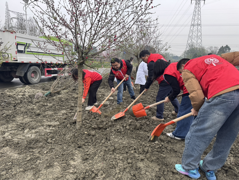 植树现场,参与者们分工协作、细致栽植,挖坑扶苗、培土浇水,以匠心栽种新绿,用行动守护生态。180余株红梅、桃树苗木扎根沃土,为北林环线增添近2000平方米绿意,让田园风光与生态景致相融相生。