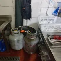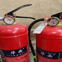 问题隐患:厨房使用液化石油气,未安装燃气报警器;现场有两具灭火器压力不足