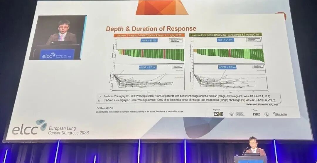 这项研究由同济大学附属东方医院周彩存教授牵头开展,周斐教授代表团队在大会上进行现场汇报。据了解,iza-bren一线联合方案在治疗广泛期小细胞肺癌方面取得了最佳疗效:中位无进展生存期长达8.2个月,1年总生存率最高达85.7%,患者靶病灶缩瘤率100%。治疗方案安全可耐受,因治疗相关的不良事件导致iza-bren的停药率低仅2.4%。