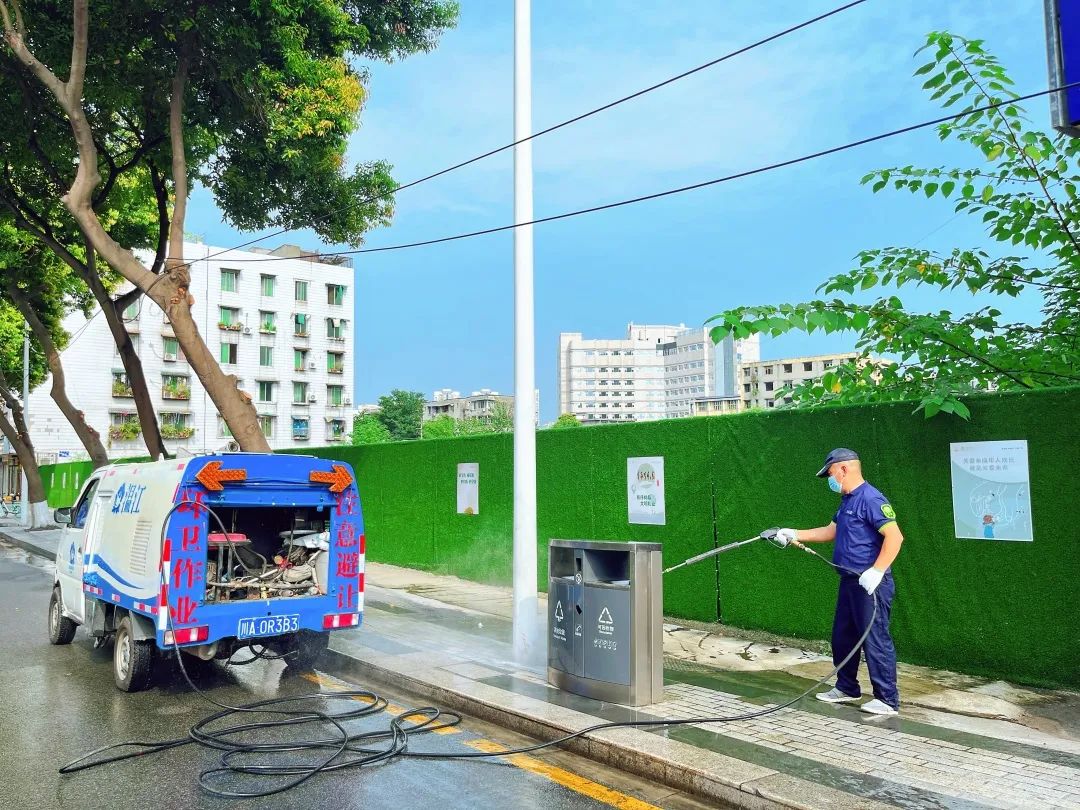 此外,环卫公司配备高压冲洗车,对街面雨水篦子、垃圾桶等设施表面存在的污渍进行全方位冲刷,着力提升清洗效果。