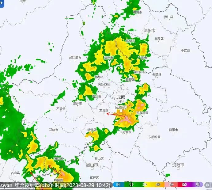 目前我市都江堰、彭州、四川天府新区、新津、蒲江、龙泉驿和主城区等地有分散对流发展,预计未来6小时我市上述地区及周边区县有分散阵雨,个别地方中雨到大雨,并伴有4~6级偏北风,请注意防范。