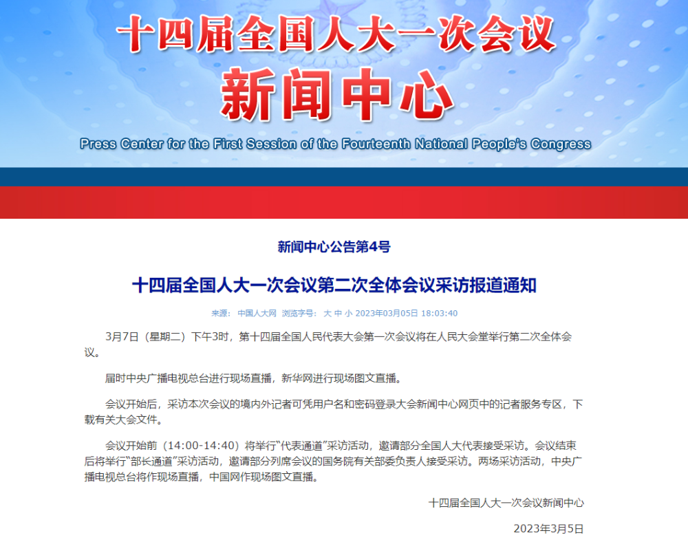 3月7日(星期二)下午3时,第十四届全国人民代表大会第一次会议将在人民大会堂举行第二次全体会议。