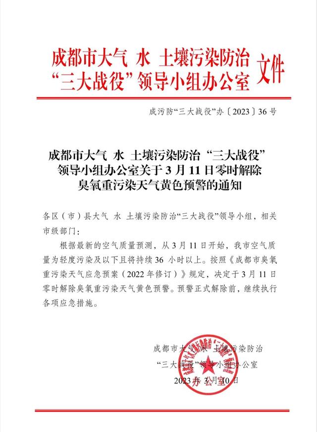 按照《成都市臭氧重污染天气应急预案(2022年修订)》规定,决定于3月11日零时解除臭氧重污染天气黄色预警。预警正式解除前,继续执行各项应急措施。