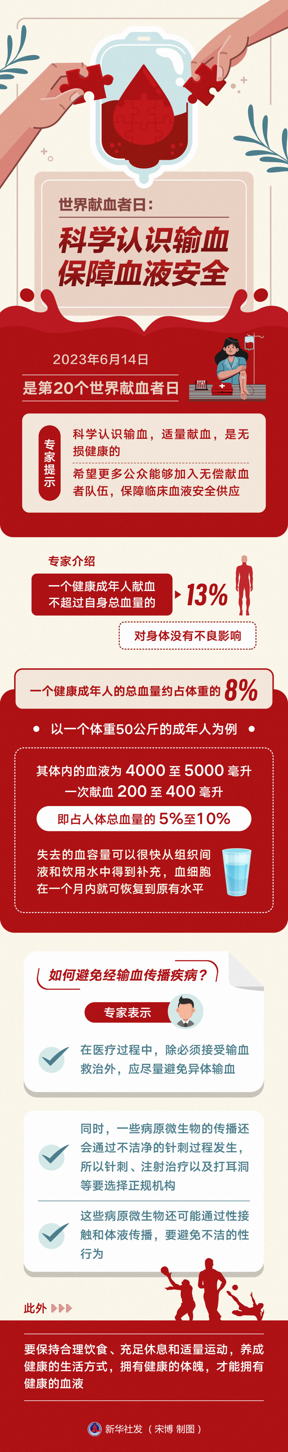 血液是一种无法人工合成、也不能长期保存的无法替代的宝贵资源。2023年6月14日是第20个世界献血者日。专家提示,科学认识输血,适量献血,是无损健康的。希望更多公众能够加入无偿献血者队伍,保障临床血液安全供应。