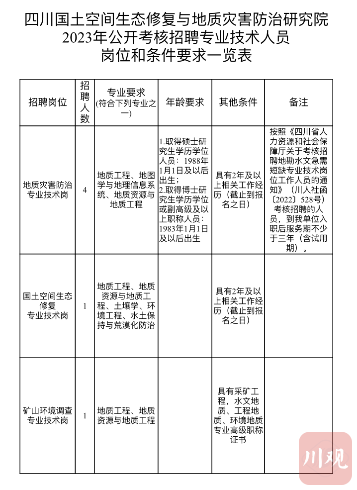四川省国土空间生态修复与地质灾害防治研究院拟面向全国公开考核招聘6名专业技术人员,具体岗位和要求↓