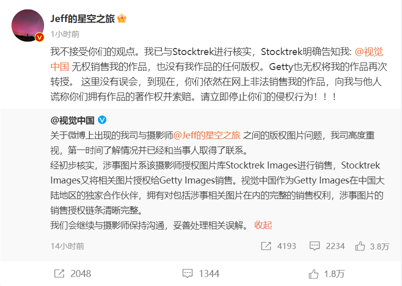 8月16日,知名摄影师戴建峰@Jeff的星空之旅 转发@视觉中国 的回应表示:“不接受你们的观点”。