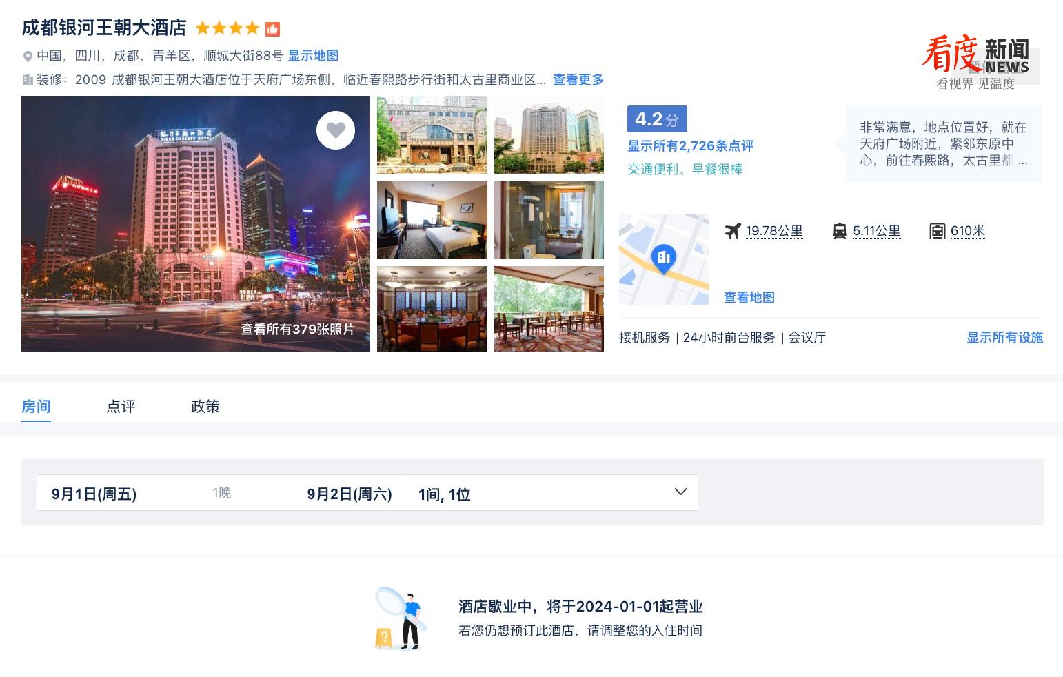 今日(17日),看度新闻记者在携程旅行网站上发现,8月31日晚,成都银河王朝大酒店依然能够预定酒店房间,但从9月1日起,酒店房间无法预订,并显示:酒店歇业中,将于2024-01-01起营业。为此,记者特地向成都银河王朝大酒店预定部工作人员打电话预定9月1日的房间,当被问及为何不能预定时,对方表示:酒店将于9月歇业,暂时不清楚之后的营业时间,要等具体通知。