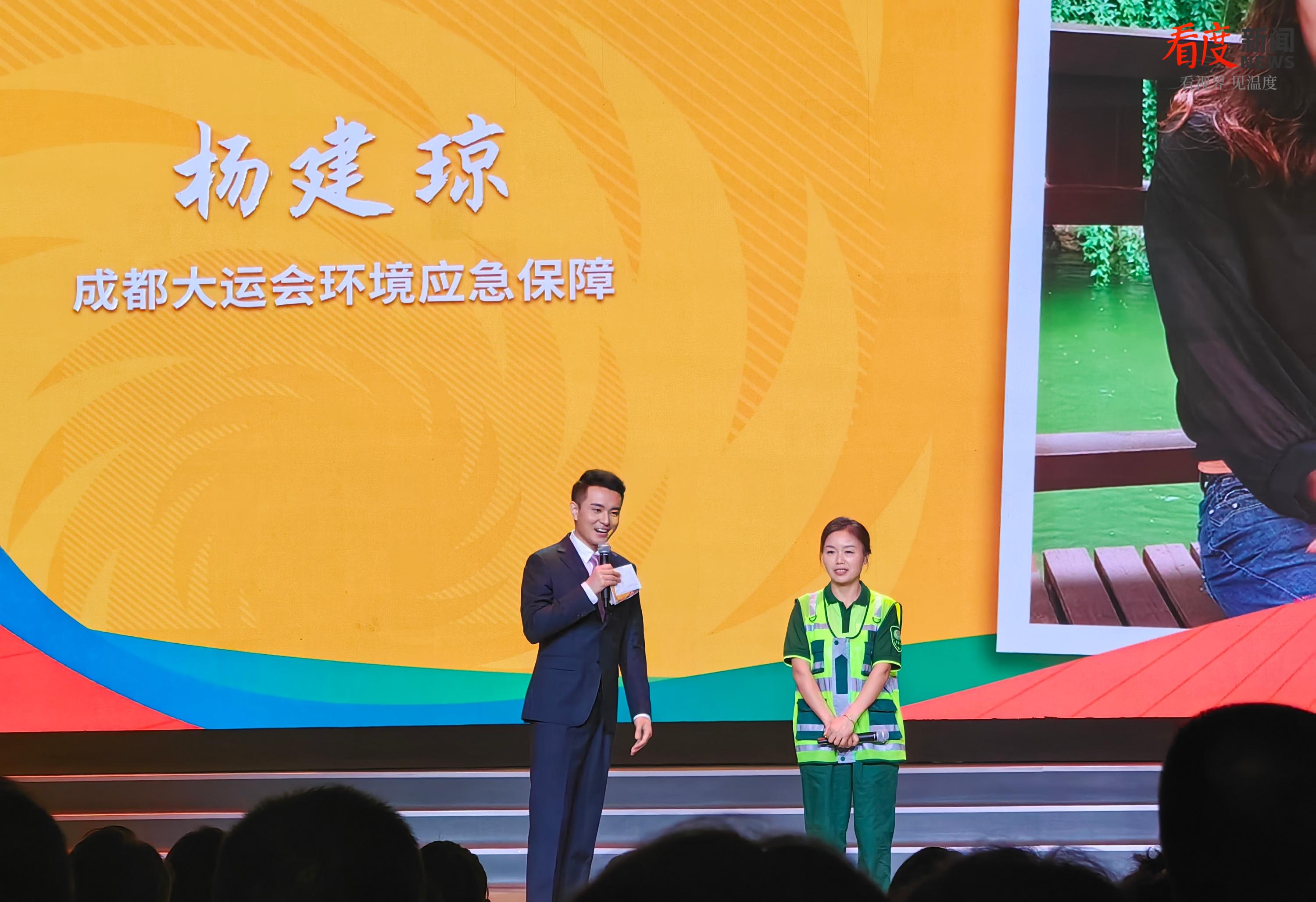 像杨大姐这样的环卫工作者还有很多,她们同样每天在酷暑下工作,早出晚归、高温劳动,只为扫亮这座城市,让大家看到更整洁文明的成都。无数为保障成都大运会顺利举办的基层工作者们,他们平凡工作背后都有着不平凡的故事。不同的身份,不同的岗位,奉献是一样的,爱是一样的。在活动现场,杨建琼在外地旅游的儿子,特别为妈妈送上了意外的惊喜。一段现场祝福的视频,一杯闪送的绿豆汤,这是爱双向的奔赴,特别的表达。在他们的故事后,童声合唱成都大运会推广曲《爱是一样的》,向千千万万这样的您,致以最高的敬意。