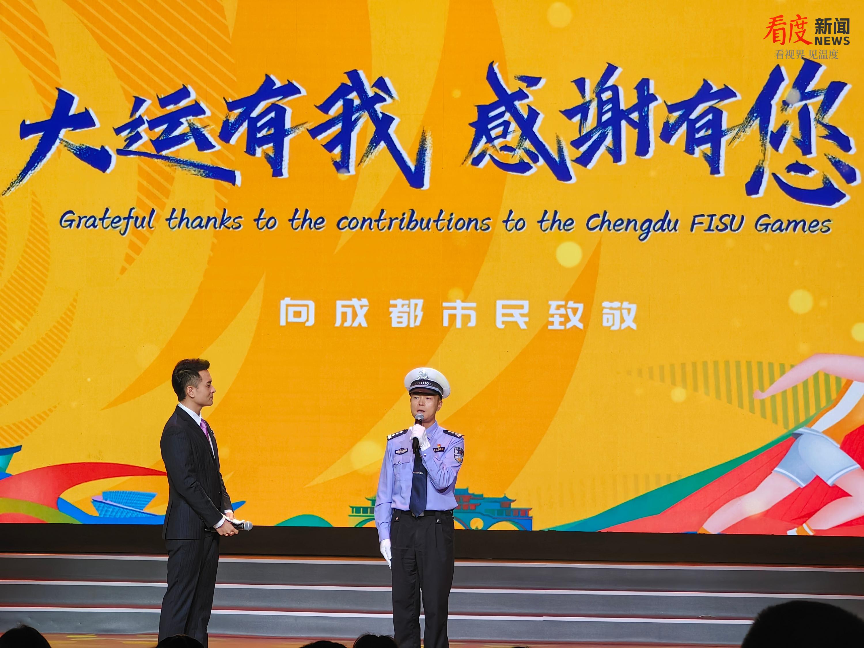 本届成都大运会共设置比赛和训练场馆49处,分布于成都市15个区(市)。如何保证赛事准时准点进行,并把对市民出行的影响降到最低,成都公安交警为此做了大量的工作。作为基层工作者代表,成都市公安局交通管理局第八分局勤务二中队中队长宋然在舞台上讲述了他和队友不辞辛劳,坚守岗位的故事。他自豪地表示,在大运盛会期间,他们中队负责的大运村、东安湖体育中心以及主要干道区域交通安全有序,没有发生一起追尾擦挂的交通事故。这些其实是全体市民共同努力的结果,广大市民朋友的配合,展现出了成都市民的文明素质。