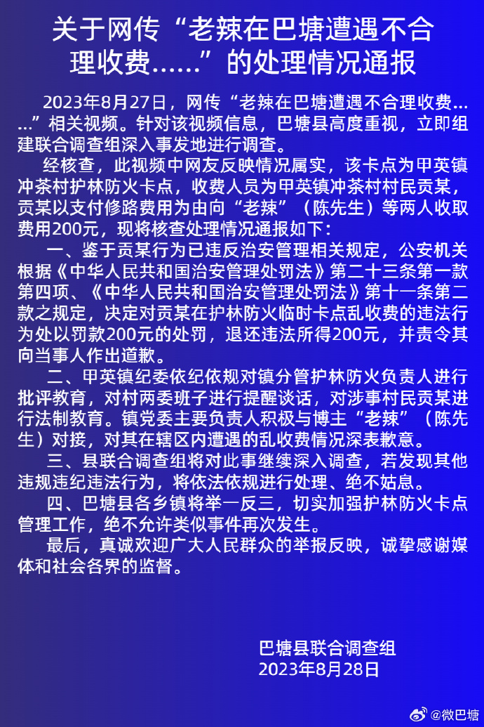 事情被曝光后,理县的处理结果是,给予收费人员岳某某停止所有工作、行政记过处分。而巴塘这边,今天上午也发布通报称情况属实,对收费人贡某在护林防火临时卡点乱收费的违法行为,处以罚款200元的处罚,退还违法所得200元,并责令其向当事人作出道歉。