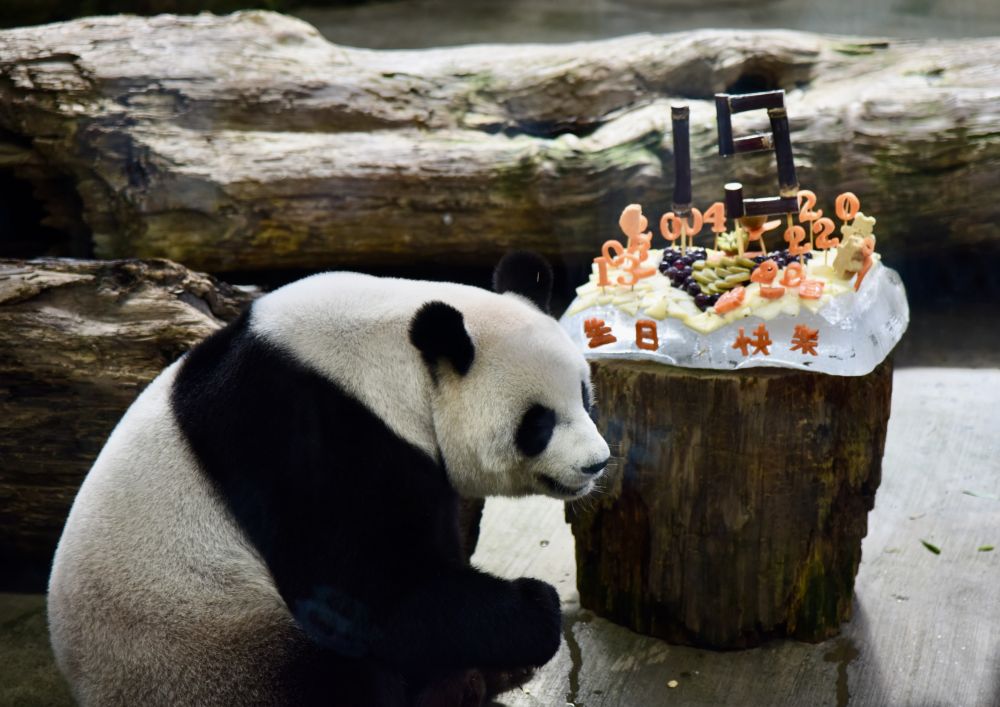 “圆圆”一进场就慢步走向蛋糕,先从摆放在“生日快乐”中间的苹果吃起。在伸出爪子拔甘蔗时不慎将蛋糕打翻在地,引来围观的游客一阵欢呼,并祝它生日快乐。随后,“圆圆”端坐着慢条斯理地品尝起散落在地上的蔬果,偶尔抬头看向围观的粉丝,引来成片的快门声。
