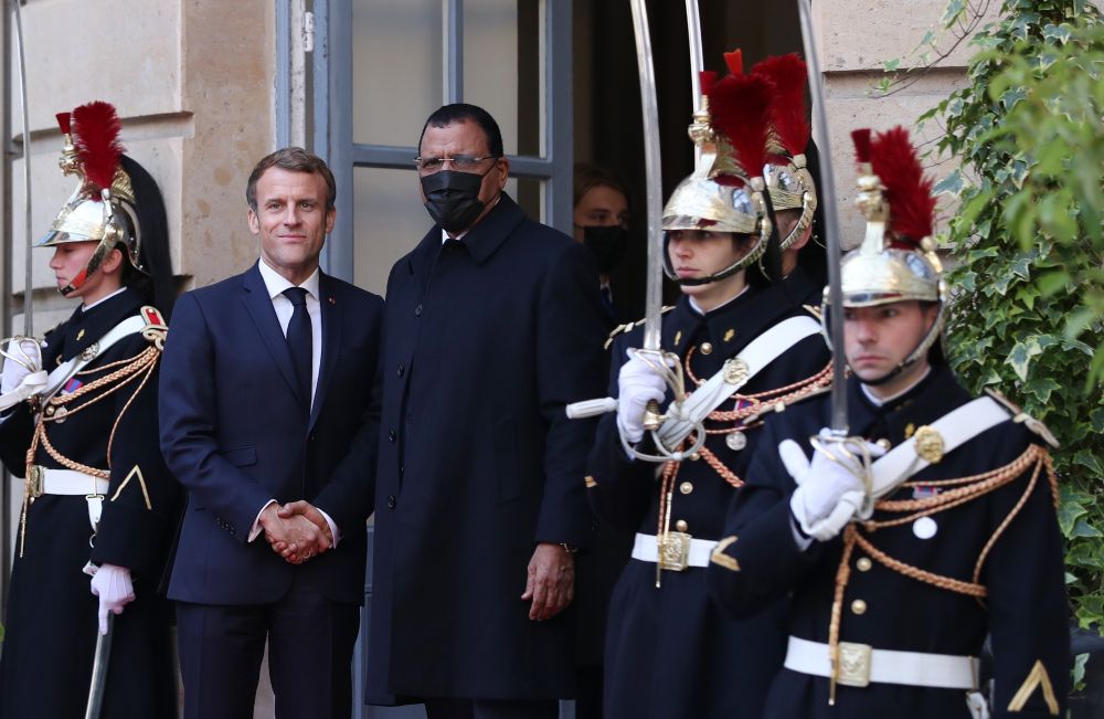 2021年11月12日,法国总统马克龙(左二)在巴黎欢迎尼日尔总统巴祖姆(左三)。新华社记者高静摄