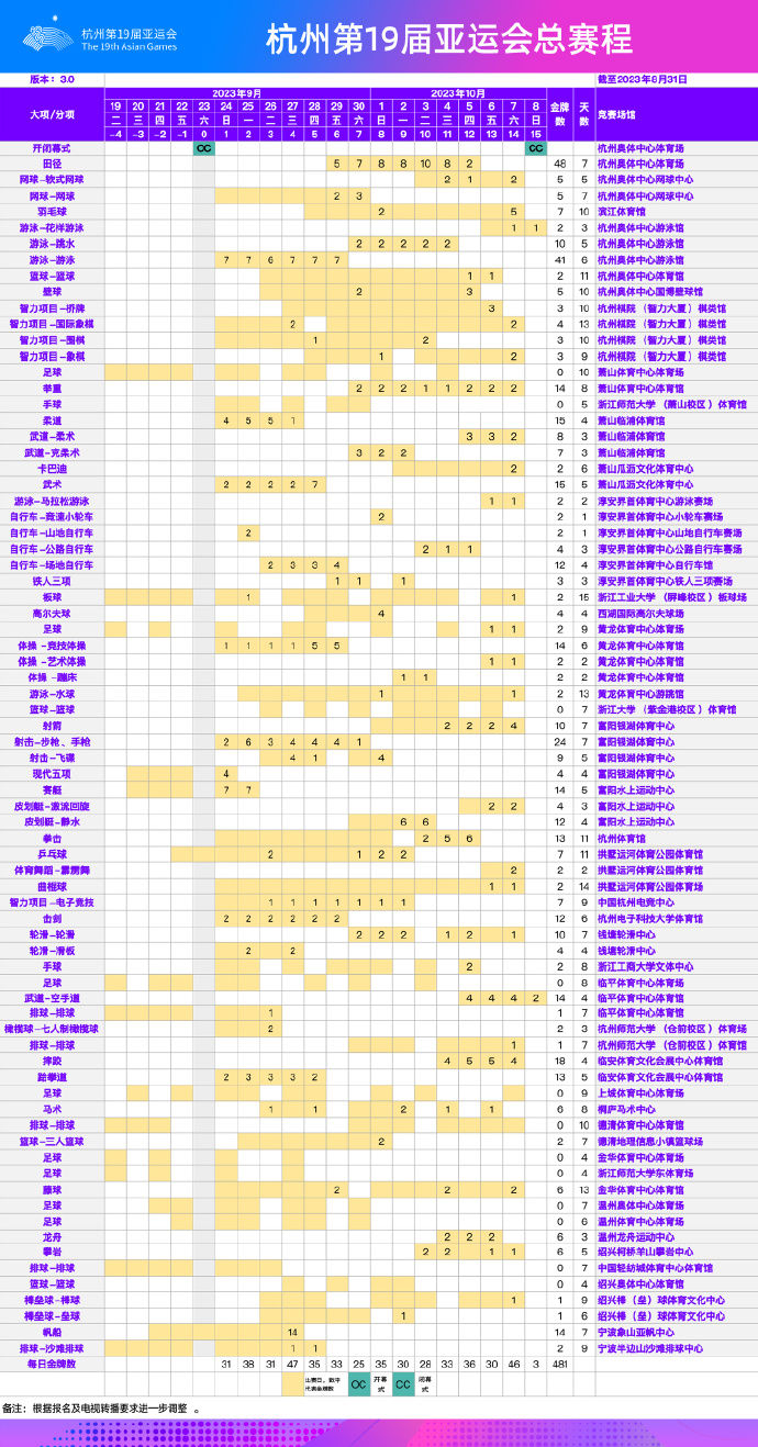 根据最新报名调整情况,经杭州亚运会各项目技术代表确认,杭州亚运会总赛程更新至3.0版,现予以发布。