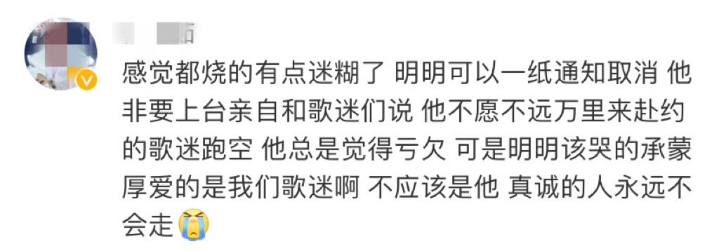 工作室@薛之谦的小话筒 也转发公告并致歉道:稍有遗憾,但他@薛之谦 想要与你们相见的心从未改变,约定好下次,再来成都,我们一定要再见到彼此,且一定不会很久。