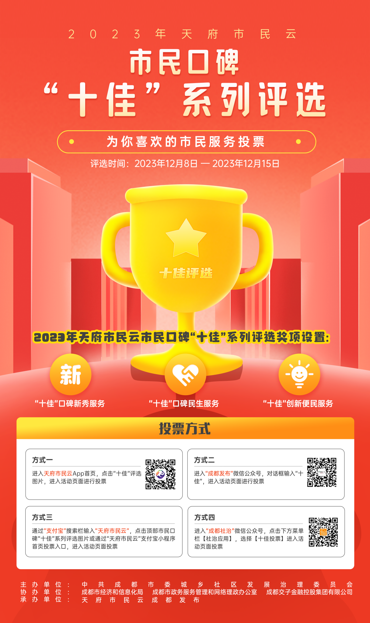 为了更好地优化服务功能,激励平台更好地为您提供更便捷更优质的服务。12月8日,2023年天府市民云市民口碑“十佳”系列评选网上投票活动正式开启。天府市民云市民口碑“十佳”系列评选活动是由中共成都市委城乡社区发展治理委员会主办,成都市经济和信息化局、成都市政务服务管理和网络理政办公室、成都交子金融控股集团有限公司协办,天府市民云、成都发布承办。