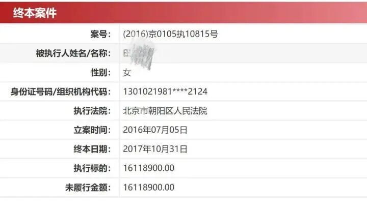 据中国执行信息公开网显示,与朱丹有关一条信息立案时间为2016年,朱丹垫付款为一千六百万元,被执行人为田某某,被执行人履行情况为全部未履行。