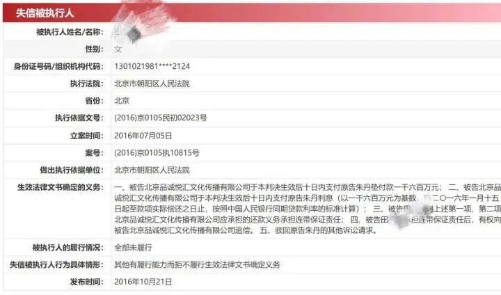 《朱丹与北京品诚悦汇文化传播有限公司股东资格确认纠纷一审民事判决书》显示朱丹胜诉。北京朝阳区人民法院在判决中认为,登记在朱丹名下增资的250万元出资属于第三人田某某所有。值得一提的是,2018年7月,该公司因未公示年度报告,被列入经营异常名录;2019年5月,该公司因违反公司登记管理条例,被吊销营业执照。