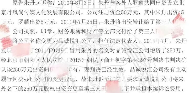 朱丹在这几起诉讼中称,自己将公司转让给田某某后,对方却将自己的出资转让给其他人。同时,还冒用自己的名义对公司增资250万元。
