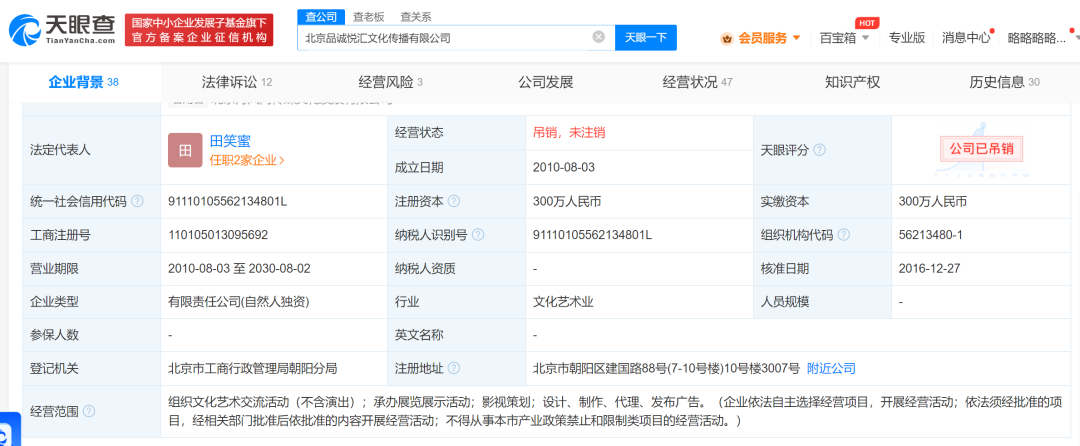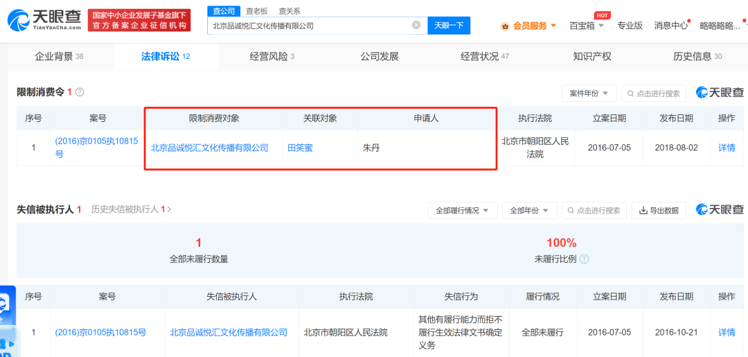 天眼查App显示,朱丹好友田笑蜜名下关联2家企业,其中北京品诚悦汇文化传播有限公司为田笑蜜与朱丹共同关联的公司。田笑蜜曾担任该公司法定代表人、执行董事、经理,朱丹曾担任监事。变更记录显示,朱丹于2016年12月退出股东行列。值得一提的是,田笑蜜与该公司曾因未支付朱丹1600万元垫付款被列为失信被执行人(老赖),并被限制高消费。