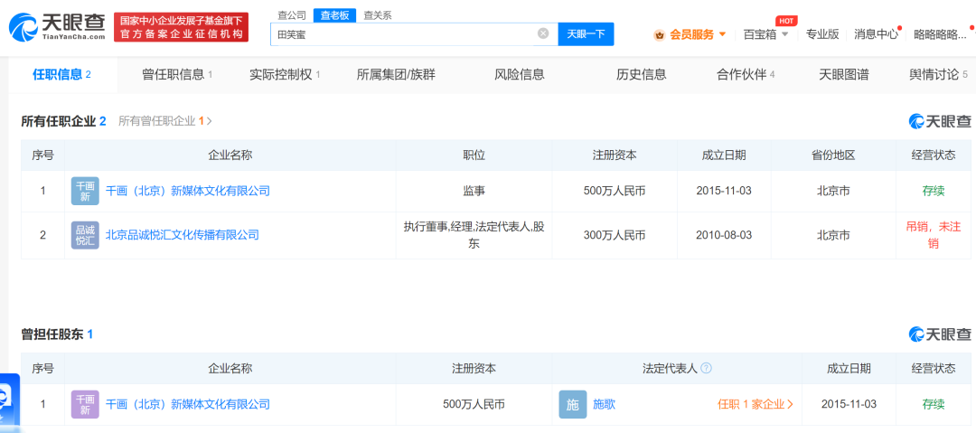 此外,田笑蜜还在千画(北京)新媒体文化有限公司担任监事。变更记录显示,2016年11月,田笑蜜退股该公司。