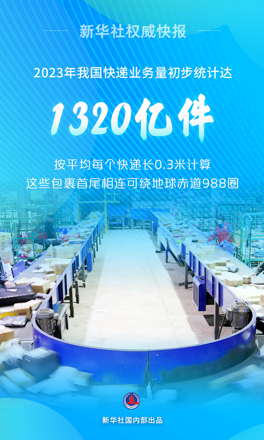 国家邮政局局长赵冲久在1月9日举行的2024年全国邮政管理工作会议上介绍,2023年我国快递业务量初步统计达1320亿件,人均年快递使用量约93件,按平均每个快递长0.3米计算,1320亿个包裹首尾相连,可绕地球赤道988圈。