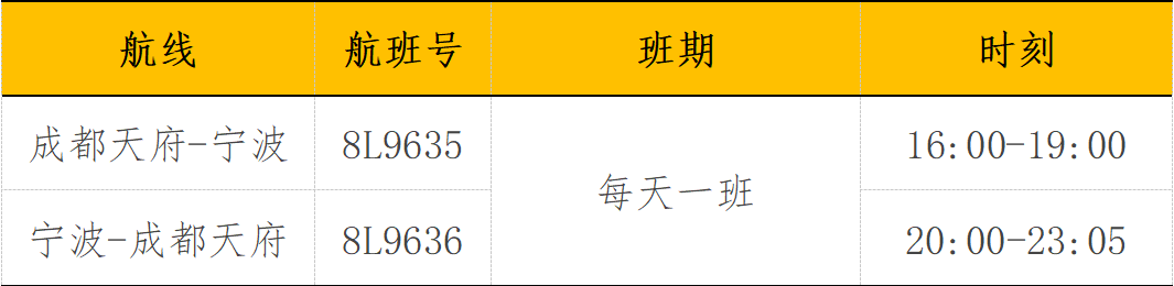 记者从祥鹏航空了解到,春运将至,围绕进一步推动成都、宁波两地文化和旅游深度融合,加强优质旅游航线供给,激发春运旅游消费市场活力,祥鹏航空已复航成都天府往返宁波航线,计划每天一班。复航初期,祥鹏航空推出特惠票价活动,单程不含税费最低票价为290元。