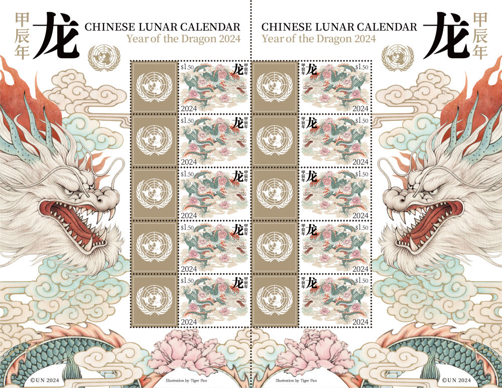 联合国邮政管理局2010年5月首次发行以中国生肖为内容的邮票,到2021年已发行了首轮12张生肖邮票。2024年的龙年邮票是第二轮生肖邮票的第3张,延续了第二轮生肖邮票版张的设计风格。版张左侧5枚邮票和右侧5枚邮票为镜像分布,左侧的龙与右侧的龙对望,增强了趣味性。