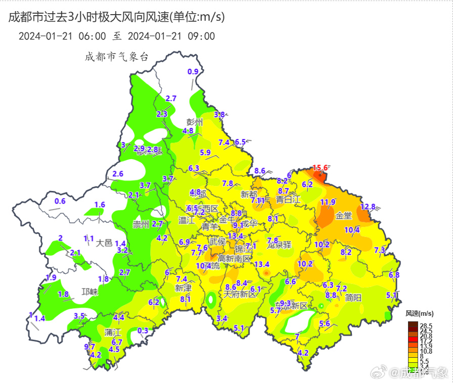 今日(21日),看度新闻记者从成都市气象台获悉,根据大风短时临近天气预报显示:目前我市双流、金堂、东部新区、新都和龙泉驿已出现大于10m/s的大风天气,预计未来12小时,我市部分地方可能受大风影响,平均风力6级,阵风可达7级或以上,请注意防范。
