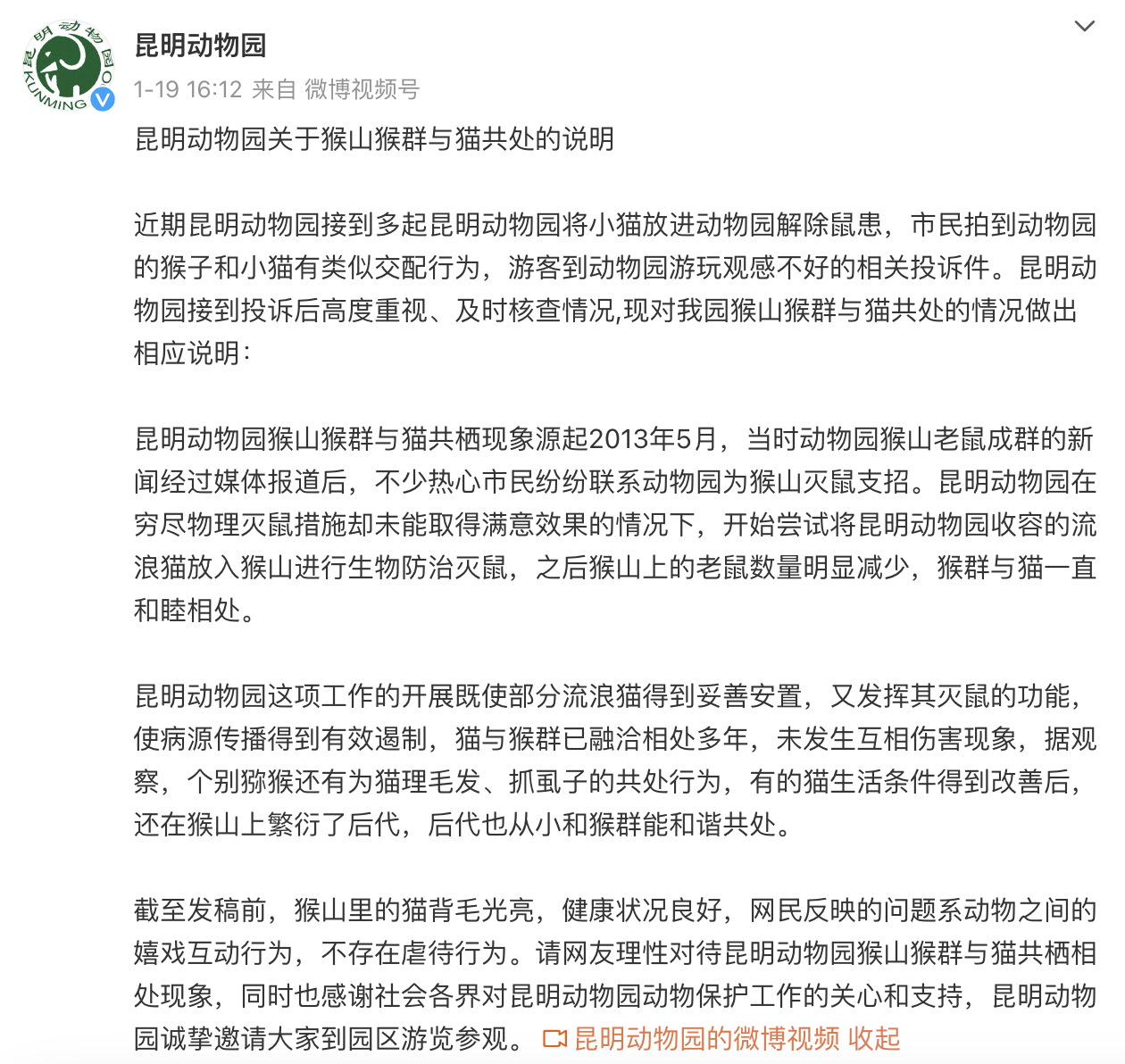 1月18日,昆明动物园发布通报,称该现象源起2013年5月,当时动物园猴山老鼠成群,动物园在穷尽物理灭鼠措施却未能取得满意效果的情况下,开始尝试将昆明动物园收容的流浪猫放入猴山进行生物防治灭鼠,之后猴山上的老鼠数量明显减少,猴群与猫一直和睦相处,不存在虐待行为。