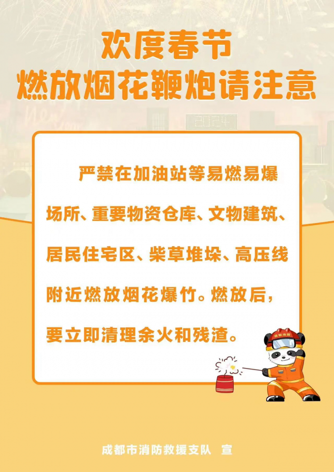 三、燃放烟花爆竹要购买合格产品,遵守当地规定,到指定地点燃放。同时儿童燃放时要有成年人陪伴,不得在室内燃放,在室外燃放时要远离可燃物,不向人群或建筑外窗喷射投放。