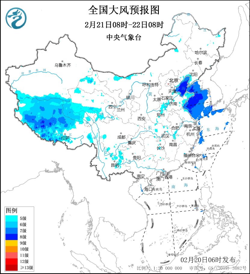 预计,2月20日08时至21日08时,西藏中西部、青海中南部、内蒙古中西部、辽宁南部、华北东南部、黄淮西部和东部、江淮西部和北部等地的部分地区有5~7级风,阵风8~9级。渤海、渤海海峡、黄海大部海域将有7~8级,阵风9~10级的大风。