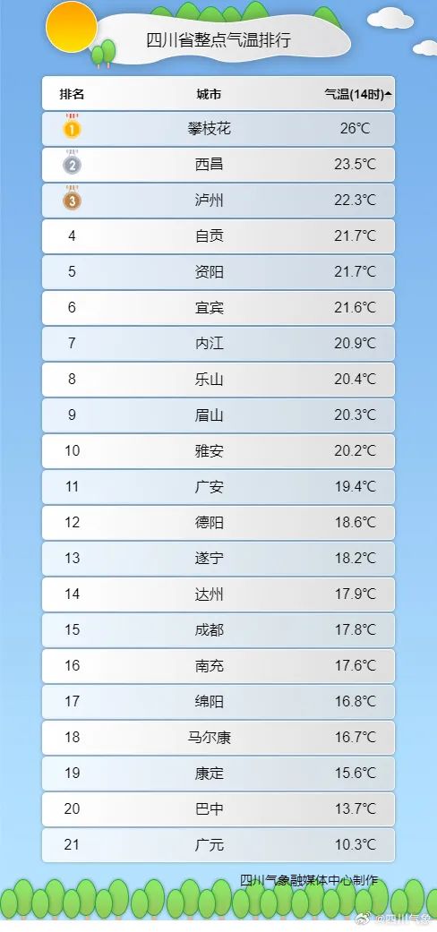 四川天气方面,据四川气象2月19日消息:四川盆地内除了广元和巴中以外,其余地方都依旧热情高涨,最高泸州达到了22.3℃。