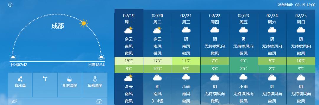 从中央气象台预报消息来看,本周三(2月21日),成都气温开始下降 ,本周五(2月23日)成都最高的气温跌至4°C,与19日的最高气温19°C相比,下降了15°C。