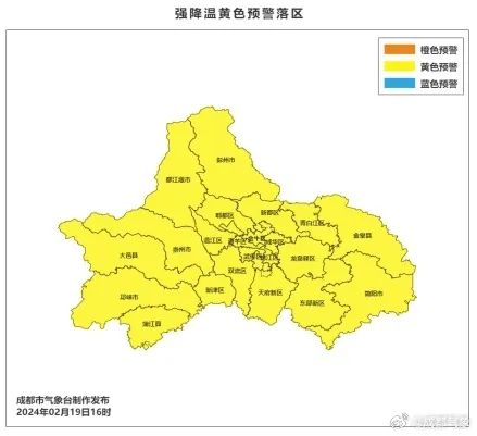 此轮寒潮来势汹汹,2月19日16时,成都气象发布强降温黄色预警: