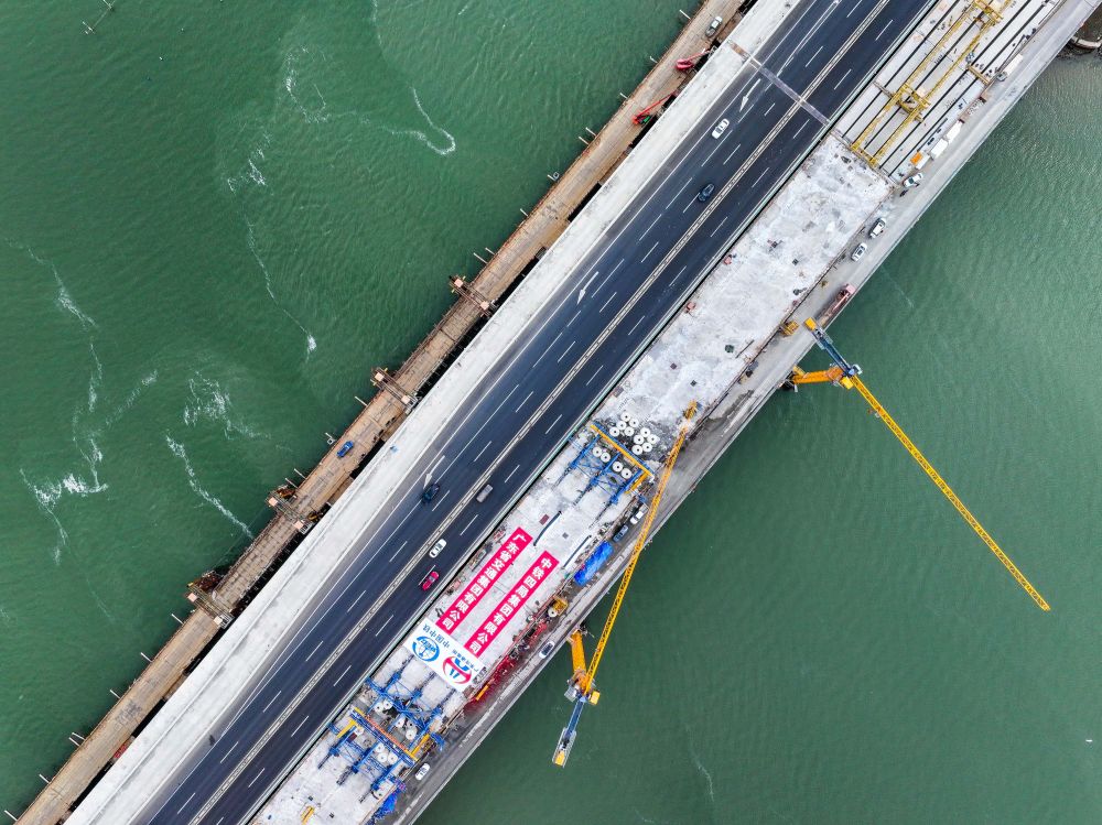 这是1月21日拍摄的深汕西高速长沙湾跨海特大桥(无人机照片)。当日,中铁四局承建的深汕西高速改扩建项目长沙湾跨海特大桥左幅主跨合龙。图据新华社