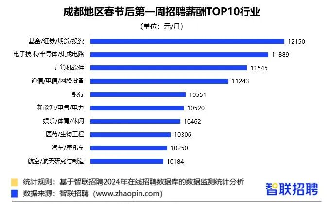 从薪酬来看,成都节后第一周平均招聘薪酬为9725元/月。从行业看,成都地区金融业持续领衔高薪行业榜单。节后首周,基金/证券/期货/投资行业平均招聘薪酬为12150元/月,位居首位,银行业平均招聘薪酬为10551元/月。