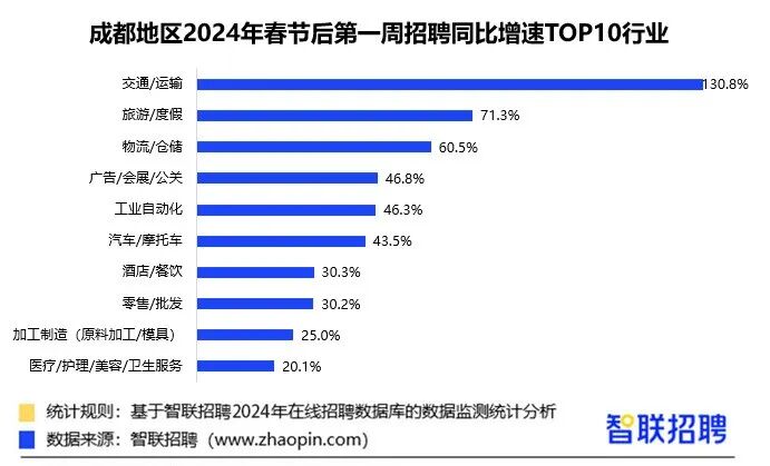数据显示,春节后第一周,交通/运输,招聘职位数同比增长130.8%,排名第一。其次是旅游/度假、物流/仓储招聘职位数同比增幅分别为71.3%、60.5%。此外,酒店/餐饮,医疗/护理/美容/卫生服务招聘职位数同比增长30.3%、20.1%,也位居增速榜前十。