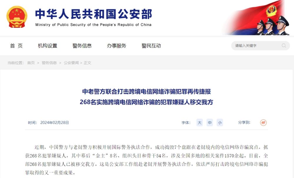 2023年以来,浙江、江苏、福建等地接连发生多起损失数额巨大的电信网络诈骗案件。公安部对此高度重视,立即挂牌督办相关案件,组织相关地方公安机关深入分析研判,发现多个盘踞在老挝境内实施跨境电信网络诈骗犯罪的窝点,串并电信网络诈骗案件千余起。今年1月,公安部派员率江苏、浙江、福建、湖南、广东、重庆等地公安机关民警组成工作组,赴老挝开展警务执法合作。在我驻老挝使馆的大力支持和协调下,案件侦办取得重大进展。1月21日,在掌握相关犯罪事实和证据基础上,工作组与老挝警方开展联合执法行动,对老挝境内的多个诈骗窝点开展集中清剿,成功抓获涉诈犯罪嫌疑人154名,缴获涉案手机2000余部、电脑400余台。随后,老挝警方根据工作组提供的案件线索,又在老挝万象、琅勃拉邦等地陆续抓获114名涉诈犯罪嫌疑人。近日,268名犯罪嫌疑人及涉案物证已通过云南西双版纳边境口岸顺利移交我方。目前,相关案件正在进一步侦办中。
