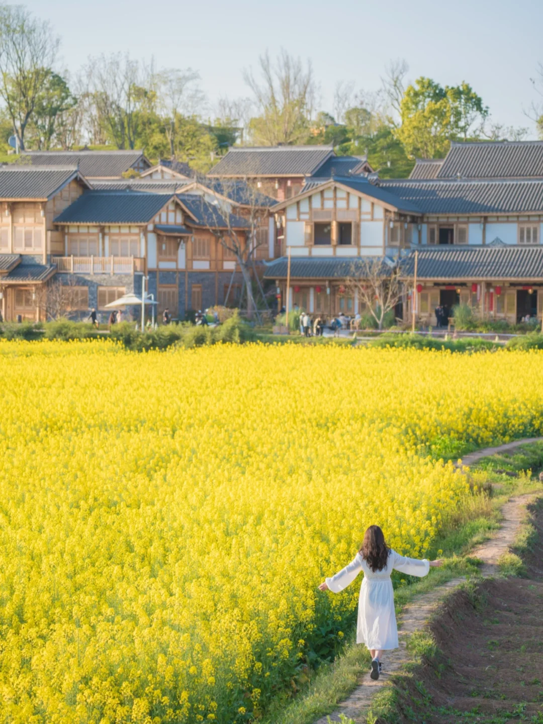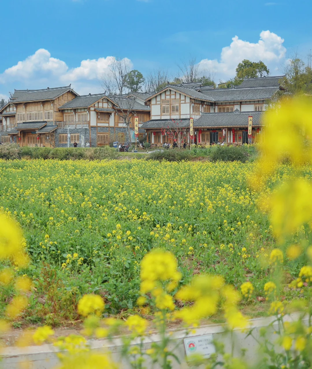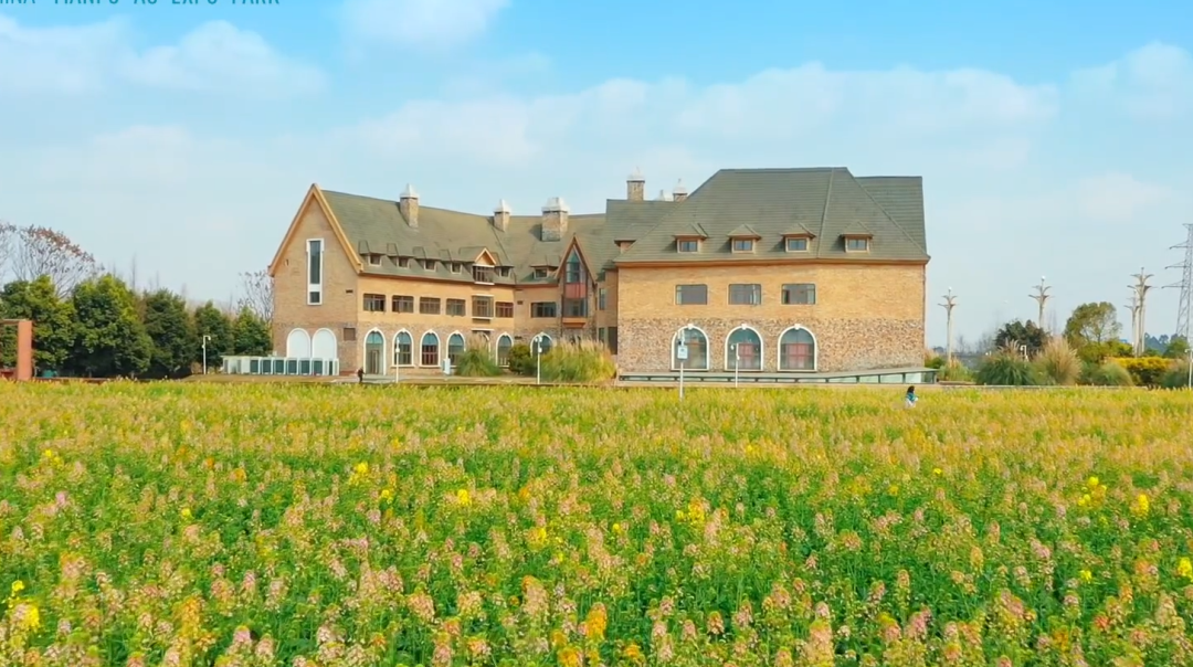 绵延成片的金黄油菜花海,搭配栈道、树林、小木屋以及这里的欧式建筑,异域风情没错了!