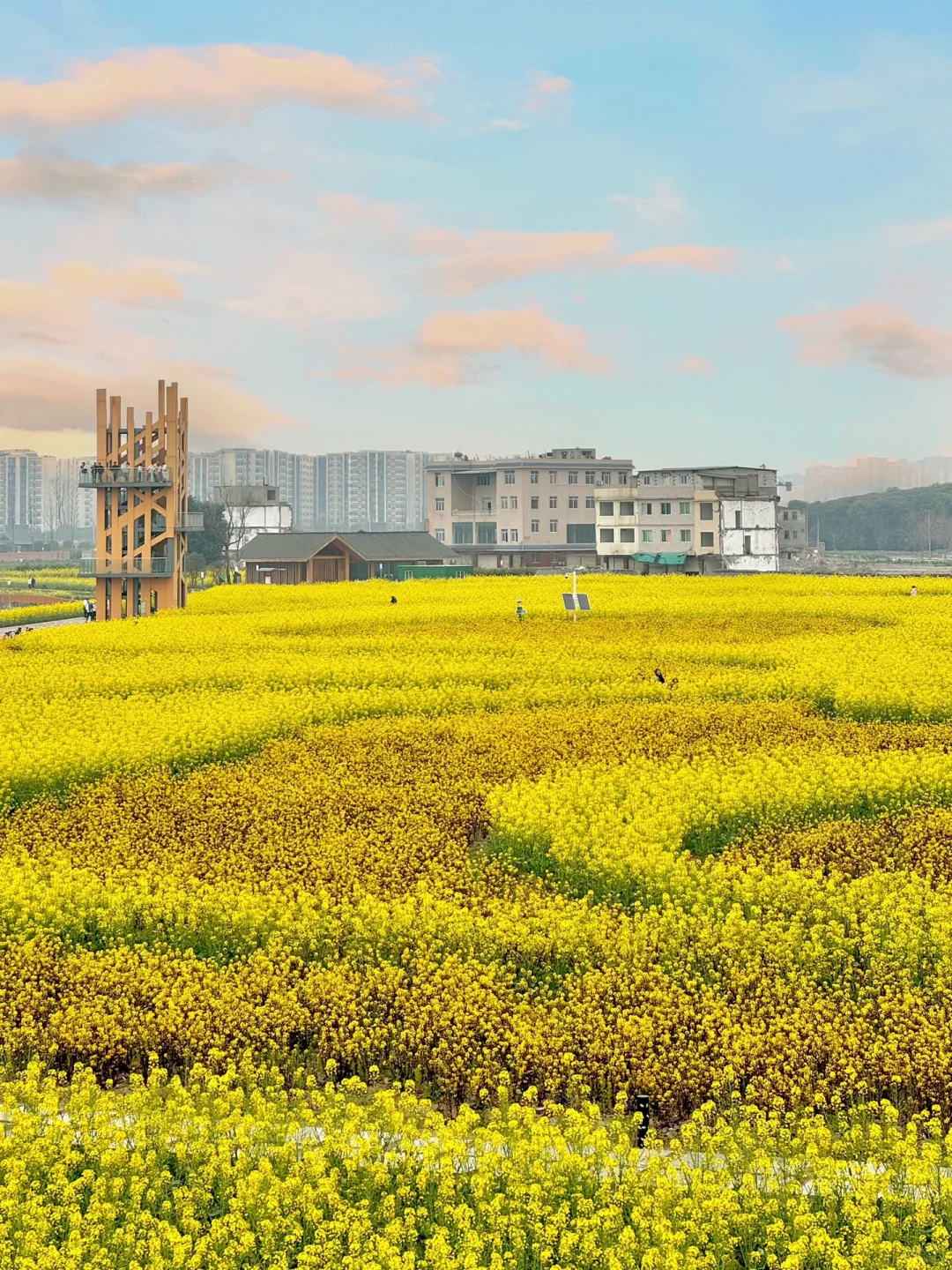 在成都南门天府新区,兴隆湖、西博城地铁站附近的官塘新村内,有一处延绵不绝的梦幻油菜花田。
