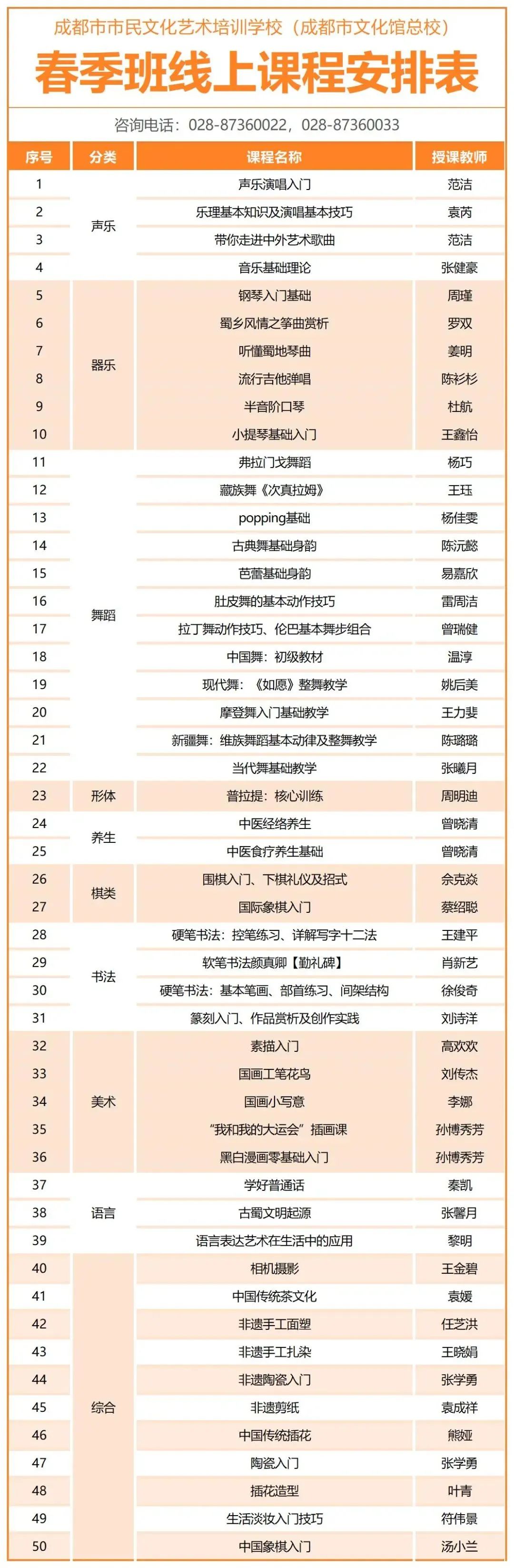 只要在成都市全域范围内,且本人热爱艺术、身体健康、能对自身安全负责、符合开课年龄要求,均可报名参加培训学习。此次招生开设153门课程,其中线下班103个,线上班50个。103个线下班将惠及2600余位市民朋友。
