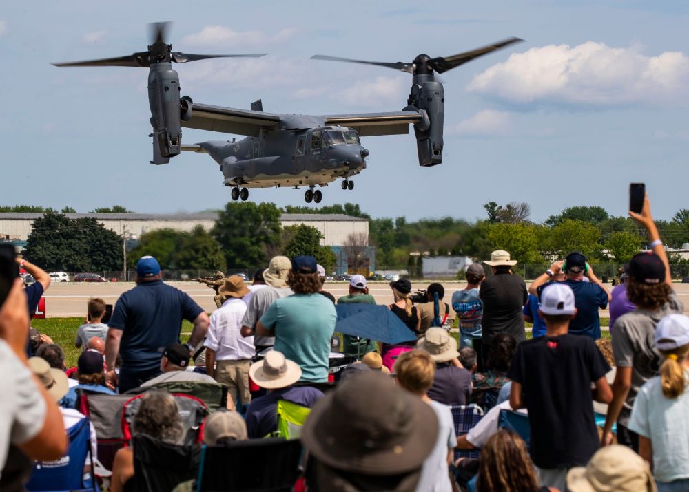 2021年7月30日,在美国威斯康星州奥什科什,一架“鱼鹰”倾转旋翼运输机在“飞来者大会”上展示其悬停能力。图据新华社